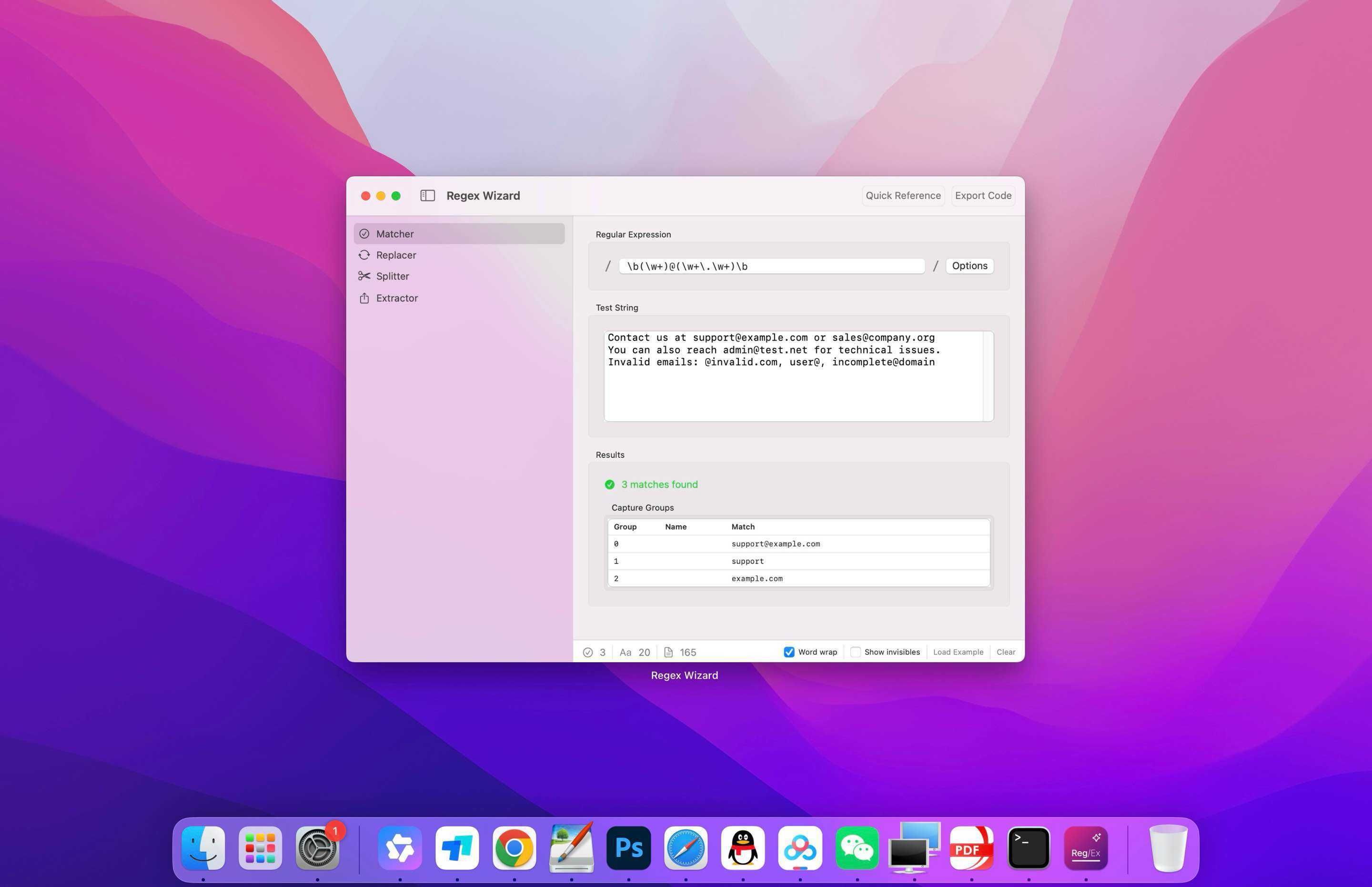 RegEx Wizard for mac一款正则表达式生成器,可以创建、测试并掌握正则表达式模式,并进行实时验证和即时反馈。